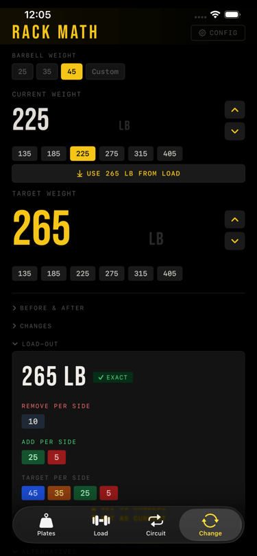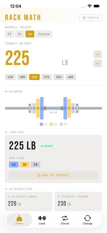 Stop fumbling with plate math mid-workout. Work in kilograms or pounds: your choice. Save time and maintain focus with Rack Math.