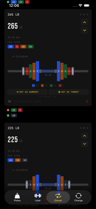 Save loadouts for different bars and let Circuit Builder smoothly map plate transitions between sets. For example, in a circuit with squats at 185 lb and bench press at 135 lb, Circuit Builder shows exactly which plates to add or remove for each exercise, allowing seamless switching without recalculating.