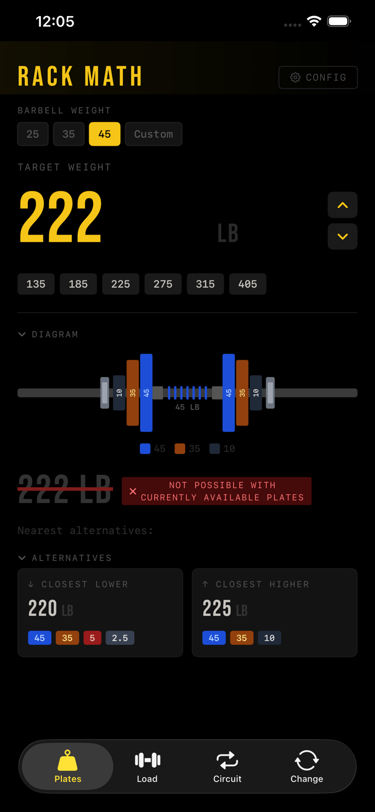 Enter a target weight and see which plates to load based on what you have. If the weight can’t be loaded, instantly view the nearest lower and higher weights that are readily available with a single click.